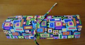 I finally got around to putting the tie on my needle holder. I've been using the thing for what seems like ages without it. When I first sewed the long strip for the tie, I couldn't figure out how to turn the thing right-side out. So I went ahead and put all my needles in the case, stuffed the tie inside, rolled it up, and promptly forgot all about it.