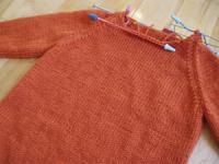 The finishing fiesta is about to begin! I've got four projects in or on on their way into the finishing basket (holiday island, ribby cardie, giranimals II, and the ladybug sweater). So this weekend I sat down, cracked my knuckles a few times and did a little warm up: I finished a sweater for a fellow Knitsmith, who's not a fan of seaming. She'll be finishing the neck, but I did the seams for her.