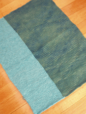 The first half of the poncho is done! I like how this pattern works with two identical pieces sewn together at an angle. Here's how it should look from the front - blue stripe down the right side to the point, green forming the majority of the body.