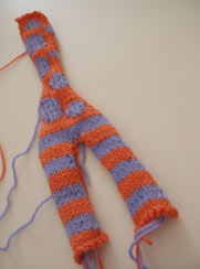 You crack me up, Lisa! Yeah, he looks like a headless giraffe, or perhaps a wishbone, but the head is actually there. The top widens out to form a round section for the head - the stockinette is rolling so you can't really see it. I know, now I've got to block him! And embroidering the eyes and nose will really help too.