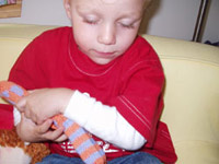 His little ears and horns make the whole thing even more adorable. The colors are nice too. It looks like one of your boys is trying to yank its head off though. heh.