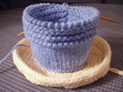 I just happened to have vaguely Wedgwood-y colors in my little stash of Sugar n Cream (perfect name for yarn to make a tea set, don't you think?!) I made most of the saucer at the playground yesterday. Note: we were at the playground a LONG time. Knitting the worsted weight Sugar n Cream down on US3's goes slow and it's none too good on my fingers, let me tell you. It's like one never-ending Bottoms-Up brim. Oh heck, I'm breaking in summer sandals anyway, what's a few calluses on the fingers!