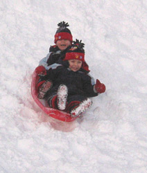 I graduated from cleaning baby poop to scooping cat poop. The joys indeed! Love the pic of the boys sledding. I made a hundred trips up and down the bunny hill with Liv on skiis last Thursday. We managed to giggle our way down the hill every single time. I found that if I held her left hand and kept her body close to mine -- steering her as necessary, we could make it all the way down on without stopping. Fun! Happy New Year back at ya lady!