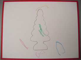 The boys' interpretation of green Christmas tree, with yellow star on top and red, blue, and purple presents underneath.