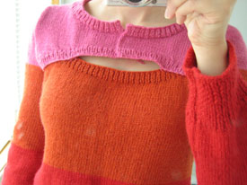 I'm with Leigh about reknitting the pink part with the "potiron"/darker orange -- the fit of everything below the pink part looks smooth and absolutely perfect, but the pink is a bit puckery and the fact that it's a contrasting colour really draws attention to it.