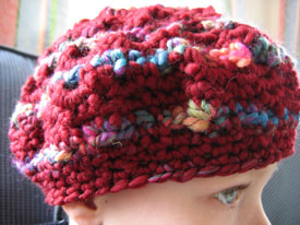 This little poofy beret hat is so adorable. The openwork is very pretty, especially in this duo-tone yarn. Unfortunately, I didn't have a picture of what the pattern was supposed to look like while I was working on it and so as the hat got bigger and bigger, I started to get worried. But I checked all my stitches and my numbers, so I knew I was following directions correctly. Finally came the last two decrease rounds and the thing went from being much too big for me to not even fitting on my head anymore. Voila!