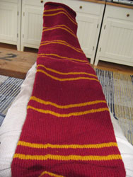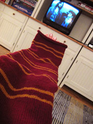 What could be better than watching HP and knitting a scarf?!!! It looks wonderful...my son requested one to go along w/ his HP Halloween costume so just need some yarn to complete the task. Thanks again for starting sockpal 2...can't wait to try a second pair!