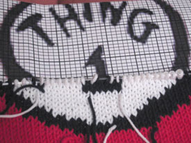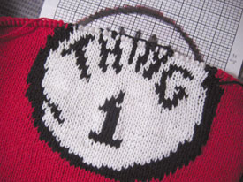 You've inspired me to dress up as Thing 1 & Thing 2 (with the boyfriend) for Halloween. I need a little advice, though...where did you get the actually emblems from? I'm not brave enough (or a fast enough knitter) to do intarsia, but I'm hoping to do a little pseudo-applique onto some red shirts.