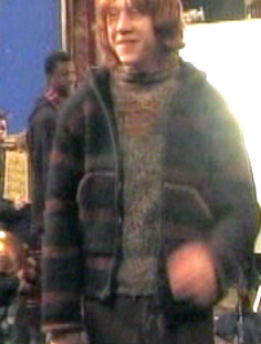 Can you see the R? You can really see the sweater (it's a raglan with button closures on the raglan line) in the scene where they're riding to Howarts on the train, but I can't find a screenshot of it anywhere. We'll just have to wait until the DVD, I guess. Still, that doesn't mean that someone can't start sketching out a pattern already! (Um, not me, but I did hear that my fellow weasley co-hostess, Jenn is thinking about it!)
