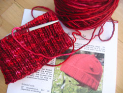 Apparently, I wasn't Harry Potter-ed out after all. As soon as I saw this bright, rich variegated red Manos at the store, I simply could not resist trying out the hat with it. If there's more of this yarn, I swear, I'm snatching it up to make the matching mittens!