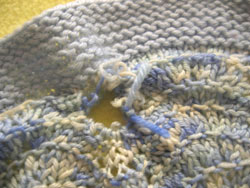 I've found four of these in S's blankie and two in B's. They are so far advanced that there really isn't much darning I can do. I've run a scrap piece of yarn through the live stitches around the hole and cinched it together as best as I can. This is, of course, a very inadequate and very temporary solution. I've started dropping hints to the boys that we'll have to throw the blankies away when they really start to fall apart. Unfortunately, they seem to think this is some sort of mommy threat and not an inevitable event. They've started hiding the holes.