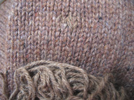 Just when I needed something to get me out of the blankie blues, mom brings me an old Woolrich sweater she got at a thrift store that was in great shape but for a thumb-sized hole in the sleeve. Could I possibly repair it? Luckily, I've practically got a yarn store up in my stash and found almost perfectly matching yarn. I created a few lost rows and voila: sweater and self-confidence saved!