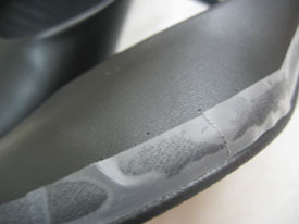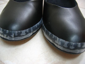 First, tape is put around the bottom edge of the shoe to mark a safe line above the sole to drill. Now, I couldn't find any Post-It tape as called for in the pattern, so I used Scotch tape. It was easy to tear into short pieces and it came off reasonably easily.