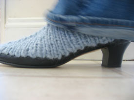 I had to comment again because I just thought of a really fun (kooky) idea for this pattern. What if someone were to knit them up so that they sorta looked something like this: http://photos1.blogger.com/blogger/5813/1829/1600/DSC01032.jpg (photo taken by this blogger: http://froginknots.blogspot.com/)? I realize that the picture is not of knitted shoes, but you get the idea -- use a shiny red novely yarn for the actual shoe part, and then a black-and-white striped stocking on top of that -- a salute to the Wizard of Oz! ;-)