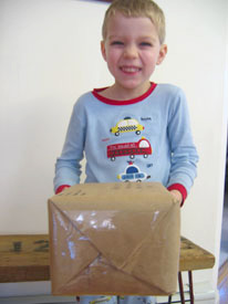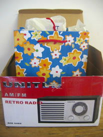 A little bit of cardboard and tape reinforcement from hubby, some padding inside, twine and packing paper outside and the radio box is off!