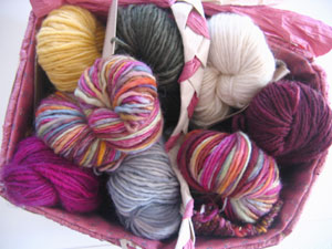 That takes me to a whopping total of seven skeins used and 20 squares knit. That's almost a third of the squares done - I can't believe it! What I can believe, however, is that making these squares is hurting my hand. It just occurred to me that by knitting only mitered garter stitch squares and short-row socks recently, I haven't purled in weeks. Nothing but knits. Can you spell RSI? Ouch! So despite the fact that all I want to do is crank out more squares, and the fact that I've found two more colors to add to the blanket,