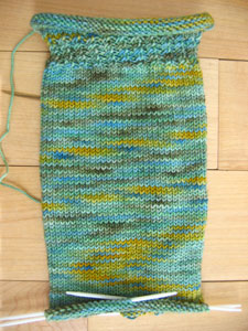 Daphne has some pretty blue-green-purple cotton socks underway. 100% cotton! Take good care of your hands, Daphne!