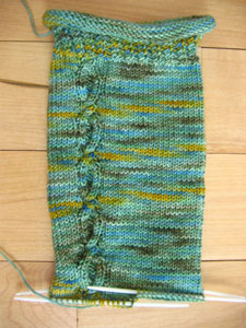 Bev is getting a jump on second sock syndrome by starting the second sock before the first one is done! She's doing a cool job modifying the Embossed Leaves Socks from Interweave Knits.
