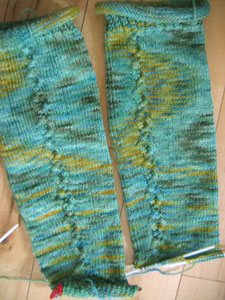 This is where I was with my socks before knitting group yesterday. Thanks to the pleasant company of my knitbuddies, an Easter-candy induced sugar rush, and another few hours of Sunday night tv knitting, I made it to my goal for this week. Both legs done. Phew!