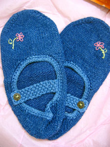 Sock sister, Erin, knit and sent me these. They are so awesome! I've been wanting to make myself some of these sock slippers for the longest time, but I never could have done as good a job as Erin did. Look at that super sweet embroidery! And the denim is just genius - they should wear well, be very washable, and best of all, they're blue! Thanks so much, Erin. You rock!