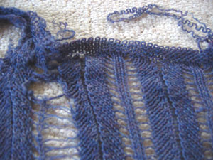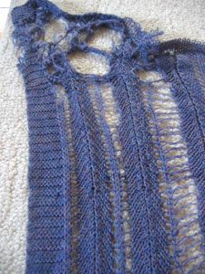 The cast on edge has opened up again and it's so thin that there's no stopping it. Each morning there's another row in his bed that has unravelled and ripped off in the night. And several of the columns of lace stitiches in the very middle of the blanket have popped stitches and are laddering all the way down to the edges.