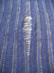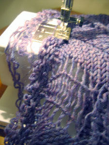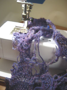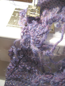 Then I sewed all around that poor corner. Can you see the crazy stitch lines following the sturdiest remaining pieces of yarn? I guess it's sort of like steeking, only the cutting happened before the sewing.