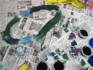 Pretty skein! Another neat thing to do is to use one of those cheap vinyl tablecloths while dyeing. They clean up really quick and are reusable =)