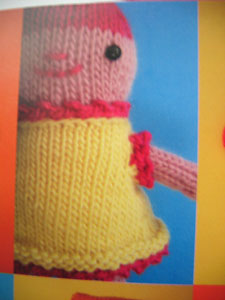 I couldn't resist the girl-baby knitting any longer! After seeing Jess Hutch's knitted robots on the cover of the new Craft magazine, I remembered the little knitted toy pattern book she published last year (it's out of print now, so sorry, I don't know where you can get it anymore), flipped through it, and found this pattern for an adorable little dolly.