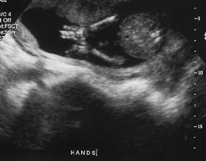 How amazing is it that the clearest parts of the ultrasound picture are her head and her hands! Definitely an artist of some sort -- knitter, crafter, musician, who knows?