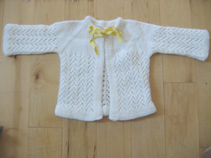 I've got two new baby knits planned for wee one on the way, both inspired by knits from grandmas. The first is a copy of a baby sweater that fellow Knitsmith and baby bumper, Johanna, wore as a baby that was knit for her by her great grandmother.