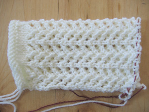 I picked up some Snuggly DK in "cream" (although it's looking kinda pale yellow to me now), because washable acrylic seemed so right for this sort of grandma sweater. The pattern, which is very well written by the way, calls for sleeves to be knitted first, then the body in one piece up to the armholes and finally the yoke. The sleeves have made for really nice knitting. The lace pattern is simple but oh so pretty and the pieces are so tiny they're going super fast.