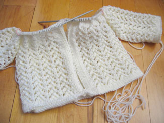 Just got word that our first grandchild, due in March, will be a girl. I can't wait to get started knitting the lacey, pretty stuff. Your sweater looks absolutely gorgeous. Where did you find the pattern?