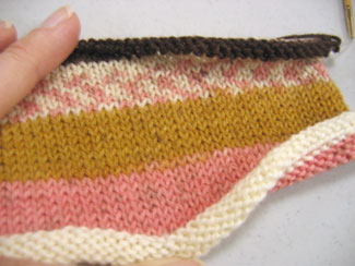 So far the pattern is awesome! My only problem is that, for some reason, I was convinced from the picture that the edgings were all reverse stockinette stitch. They're not really, but once I got it in my head, I decided I really wanted it that way, so I changed the first sock yarn row to flip the edging. And unfortunately I'm not in love with the color sequence that's starting the bottom of the sweater. I want to see more of that dark chocolate brown! So I'm going to call the above half front panel a swatch and will reknit the first front panel starting at a different point in the sock yarn's color sequence.