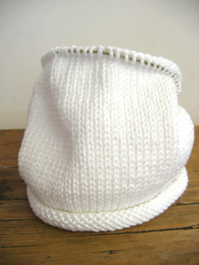 I'm trying to ignore what that comment means for delivery and have returned to the hat factory to make more hats for that big head. (Some of you asked about the sizes I've been making. I made two hats in a newborn size on an 11" circular needle, but all the rest have been in a 0-6 month size and knit on a 16" circular. They should be large enough for her big head.) To prepare for hat class tonight, I knit the white hat for the rosebud wreath up to the decreases.