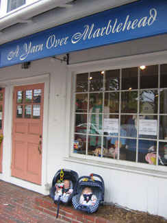 Our first stop was A Yarn Over Marblehead in Marblehead (of course). Cute store, very friendly, and a nice mix of yarns. Some of my faves in the store were Southwest Trading Company's Karaoke yarn (they had the cutest little sample knit up), Mission Falls wool (it's great to see this back in the stores again), and the locally hand-dyed Marblehead merino. The owner is working on a big Charmed Knits window display, so you know I'll be back up there soon to check it out and sign a few books.