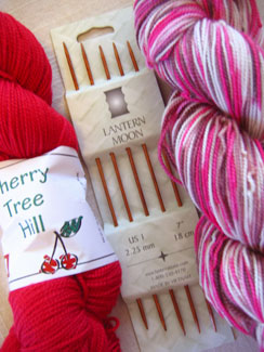 There's some cherry red Cherry Tree Hill supersock for embossed leaves for me and a simply gorgeous skein of the new specially dyed Simply Socks colorway of Cherry Tree Hill supersock. It's fabulous! I also treated myself to a lovely set of rosewood dpns. Knitting with these is like heaven! I'm slowly collecting these in all the right sizes for sock knitting (slowly, because they are craaazy expensive!).
