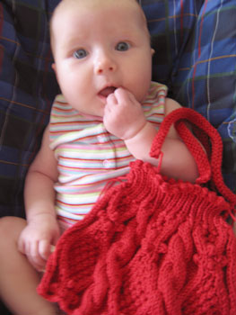 What a cute shot of the baby and the bag...I've had my Rowan kit since this Feb and haven't knit it yet. I'm very surprised to see how small the finished object is.