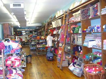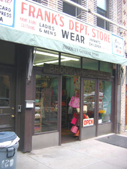 Brooklyn General (see the sign under the Frank's sign?) was great! It's a huge space with beautiful old-fashioned wood display cases on the walls (very general store-y), filled with gorgeous, gorgeous yarns in every color (really, Debbie Bliss, Rowan, Morehouse Merino, Tess, Alchemy, Savannah, Elspeth Lavold... and each one in more colors than I've ever seen in one store!). They also have retro vintage and hip modern fabrics and neat little handmade items for sale. It's just like a crafter's general store with enough fabulous yarn and fabric to keep your hands busy for a long time, all the necessary notions for sewing and knitting, and all in a very relaxed and friendly neighborhood atmosphere.