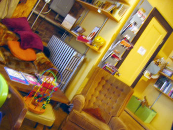 And right at the end of the same street as Brooklyn General is the coolest little coffee shop cafe ever, the coffee den. It's waaaaay kid-friendly and the whole back of the store looks like some ultra-funky retro living room. There's even an old tv with a fake fireplace log in it. Hilarous! And awesome grilled cheese, too!