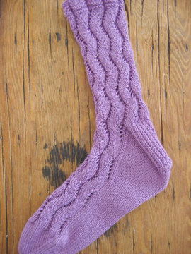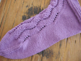 I finished the first waving lace sock! Whew, that was a lot of stitches. I'm not used to these tiny needles. I'm such a small needle wimp! But I really want to get these done in time, since these are actually socks for a pal who didn't get any in the last round and I don't want them to be late this time.
