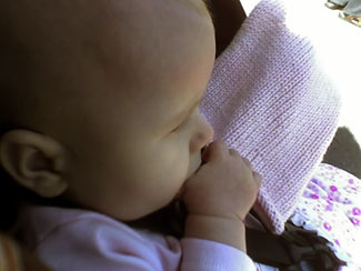 oh man, she is the cutest baby EVER!! :) I don't know what to tell you about all your knitted hats, but at least she likes them! :D hehehehe eventually they would become dolly or bear hats anyway, or maybe hats for HER babies someday - but at least she'll wear some hat to keep her little head warm :) hehehe My sister and I were just about bald until we were 2, so we needed hats too! :) don't worry, we've MORE than made up for it in the amount of hair we ended up with, and I'm sure she will too. :)