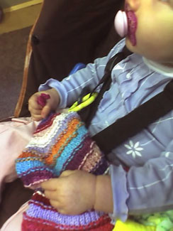 Not at all. What she does is immediately take them off and cuddle with them. I think all those nights snuggling with her blankie has made her very fond of the feel of knits. (Oooooh, something I understand very well!) But she might just be a little too fond of them if it means she won't ever wear a hat! Oh, she'll wear a store-bought jersey hat, but all these knit hats have simply become head-shaped loveys. She'll play normally with the fabric turtle buddy I made her, but she only wants to snuggle with her knitted dolly. I can't wait to see what she does with the mittens!