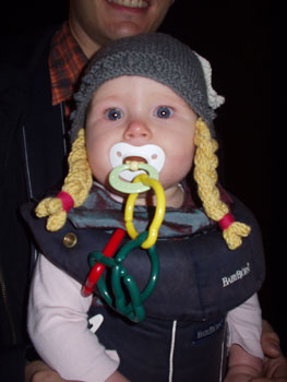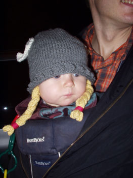 Hey, do you like my hat? Swedish Sockapalooza, Sandra, sent it to me all the way from Sweden to wear so I could match wee one. It was so fun being a viking mama - thanks so much Sandra!! And check out the shoes wee one wore with her costume. They were a baby shower gift from Johanna's mom (now we know how Johanna got so crafty!). They're Raggedy Ann booties and I just love 'em. They were perfect for the costume. And off we went...