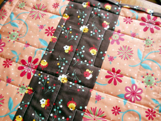 Yeah, I did all the stitching in the ditch on that one too this weekend. It's still all pinned together because I need to add some more quilting. The quilting needs to be done every 5 or 6 inches so that the batting doesn't shift around with wear and washing (this number varies based on the batting you use). For this quilt pattern, Amy Karol recommends stitching in the ditch along the long vertical seam lines between the strips and then adding more vertical quilting lines between them. The rulers in my fabric however go horizontally, so I decided not to add more vertical lines to the quilt. Instead, I quilted along the horizontal seams where the flower fabric was set into the ruler strips. Next, I'm going to do some more quilting following some of the lines in the actual design on the fabric. This whole process of thinking up ways to quilt your quilt is so fun. It's a whole 'nother design element that you don't even realize is there until you do it yourself.