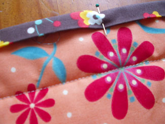 Looking good! Instead of using pins to hold the binding in place, I use some hair clips to hold it down while stitching. Makes the quilt easier to move around and the clips are easier to find then pins if they fall out. They also hurt less if you step on one. :D