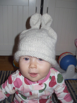 I just finished knitting the striped Baby Marley Hat in the Itty-Bitty Hats book and it is now my favorite baby hat. It is too cute! The hat was interesting to knit as the stitch pattern changed with each color of the rainbow. I borrowed the book from the library, but I think I will put it on my Christmas list! Your bunny hat is adorable as is your wee one!