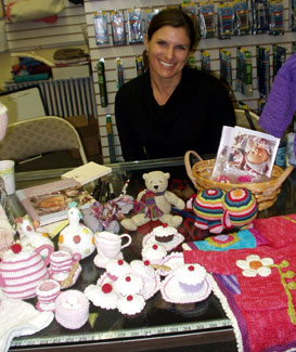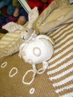 I was not at all surprised to find that she was just as sweet as the adorable little knits in her books. She brought along a whole trunk show of her knits and, let me tell you, all those itty bitties were even cuter in person! Can you see the teensy knitted teacups and that wonderfully stripey elefant. Chubby bunny was also there. I looooove him!