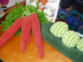 And the giant over-sized chenille peas and carrots were even funnier in real life. I don't know what you'd do with them, but when you see them in person, they are so outrageously huge and stuffed like something Claes Oldenburg would knit, that they're suddenly so cool, you want to make them. They're a riot!
