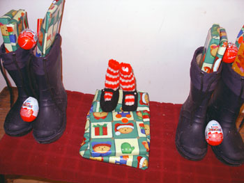 Oh, we hang stockings rather than shoes--and St. Nicholas has run out of presents by the time he gets to our house. He leaves peanuts in the shell, pistachios, Christmas candy and some small little presents--such as snowflake earrings for my daughter, tea for my other daughter and this year--for the first time--St. Nick left something for me!!! A Willie Nelson CD!! My first husband called St Nicholas Day a "test of faith for Christmas"!! Sweet little booties for the little one!