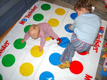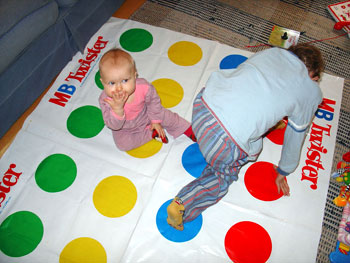 hey, we played Twister too! Zoe style - rubber band colored hands instead of left and rights. yellow hand yellow. Red hand green. fun for all.